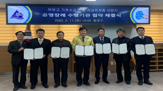 부산 동래구(구청장 김우룡)는 지난 11일 구청 회의실에서 구청장, 장례식장 대표 등이 참석한 가운데 부산 최초로 ‘무연고 기초수급자 및 차상위계층 공영장례지원 업무 협약’을 체결했다고 13일 밝혔다.