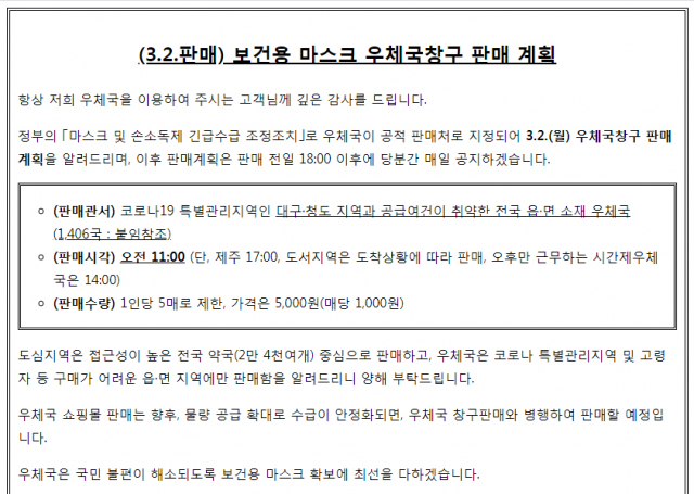 이와 함께 2일부터는 판매시간도 오후 2시에서 오전 11시로 앞당기기로 했으며 우체국에서 당일 판매수량을 사전에 안내하기로 했다. 우체국은 읍·면지역에서 판매되기 때문에 부산의 경우 기장군에 있는 좌천, 일광, 부산모전, 월내, 부산철마, 부산정관 등 6곳에서만 판매된다. 이 때문에 부산의 다른 지역에서 공적판매 마스크를 구입하려면 약국과 하나로마트를 찾아야 한다.