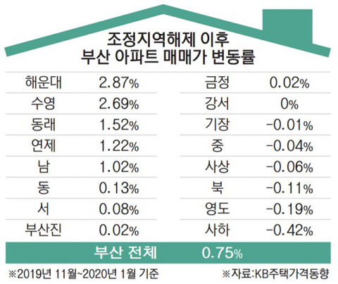 3일 KB주택가격동향 자료 분석에 따르면 부산 전역이 조정대상지역에서 해제된 지난해 11월부터 올해 1월까지 해운대구의 아파트 매매가는 2.87% 올랐다. 같은 기간 부산지역 전체 시세가 0.75% 상승한 것과 비교하면 3배 이상 높게 뛰었다. 뒤를 이어 수영구 2.69%, 동래구 1.52%의 상승률을 보여, 조정지역 해제 지역 위주로 시세가 살아나고 있는 것을 확인할 수 있다.