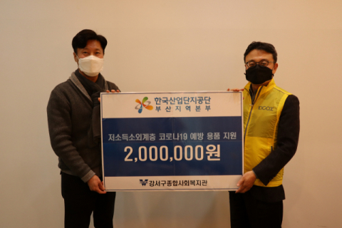 한국산업단지공단 부산지역본부(본부장 이장훈)는 지난 2일 소외계층의 코로나19 예방 용품 지원을 위한 성금을 강서구종합사회복지관(관장 황석영)에 전달했다.