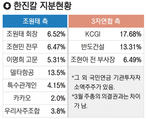 이달 말 한진그룹의 경영권 향배를 정할 한진칼 주주총회를 앞두고 KCGI 등 ‘3자연합’과 한진그룹 간 경영권 분쟁이 가속화한다. 주총에서 치열한 표 대결이 예고된 가운데 한진그룹과 3자연합은 매일 설전을 벌이고, 우호세력을 통한 한진칼 주식 매입도 멈추지 않는다.