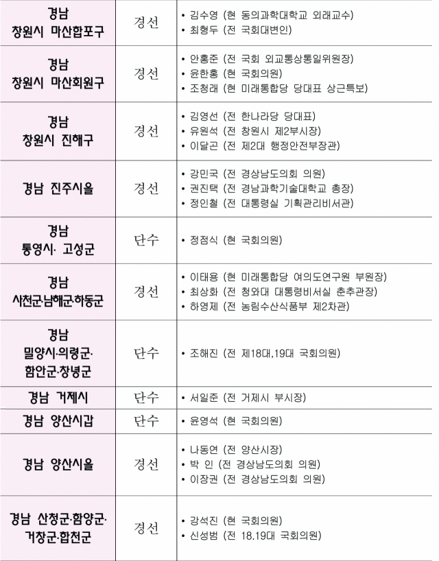 동래(경선) : 김희곤 전 해수부 장관 정책보좌관, 서지영 전 청와대 행정관