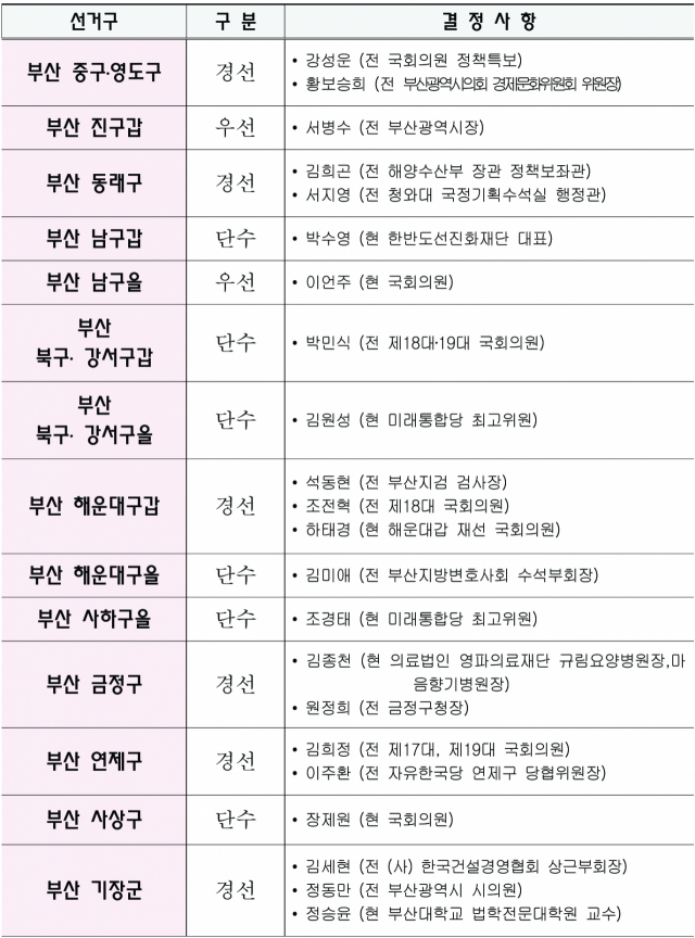 미래통합당 공천관리위원회가 서병수 전 부산시장을 부산 부산진갑에, 이언주 의원을 남을에 각각 우선 공천하는 등 부산 18개 지역구 가운데 14개 지역구 공천 결과를 발표했다. 아래는 통합당 공관위 발표 명단.
