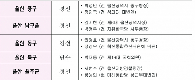 기장(경선) : 김세현 한국건설경영협회 상근부회장, 정동만 전 시의원, 정승윤 부산대 교수
