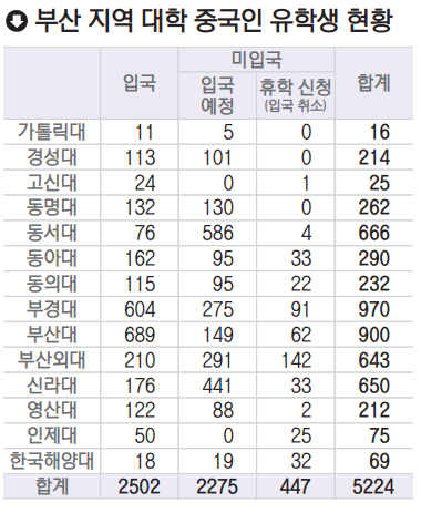 5일 〈부산일보〉가 부산 지역 14개 대학에 재학 중인 학부생, 대학원생, 교환학생, 어학연수생의 숫자를 집계한 결과 중국인 유학생 숫자는 모두 5224명이었으며 이 중 2502명(47.9%)이 입국한 상태, 2722명(52.1%)은 입국하지 않은 상태로 나타났다.