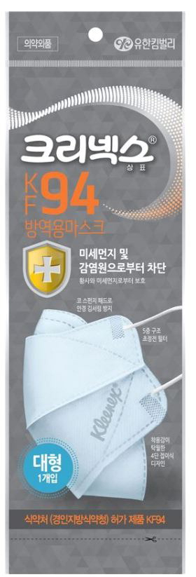 크리넥스 ‘방역용 마스크 KF94’는 4단 접이식 디자인을 통해 입에 마스크가 닿지 않게 만들었고, 코 부분에 스펀지 패드가 부착돼 있어 흘러내림을 방지해준다. 5중 구조의 초정전 필터로 더 섬세하게 미세먼지를 차단하며 머리 뒤로 고정할 수 있는 연결고리가 있어서 더욱 확실한 밀착력을 제공한다.