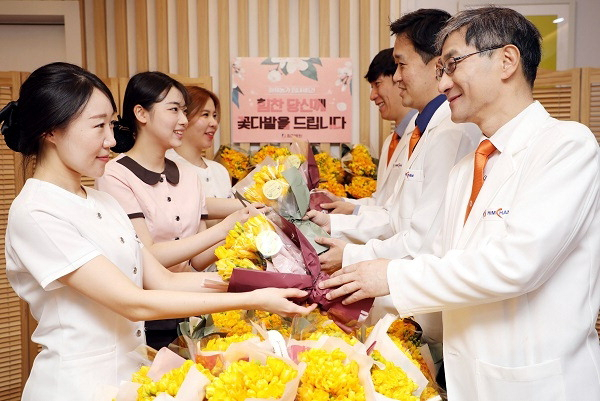 힘찬병원 이수찬(맨 오른쪽) 대표원장이 지난 13일 화이트데이를 앞두고 전 직원에게 꽃다발을 선물하는 깜짝 이벤트를 진행했다.