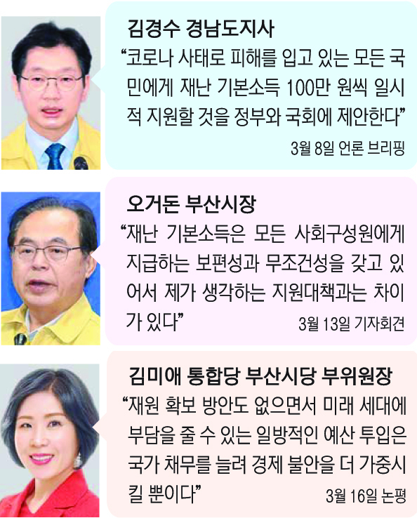 반면 오거돈 부산시장은 13일 “재난 기본소득의 취지나 목적에는 이견이 없지만 모든 사회구성원에게 지급하는 보편성과 조건을 따지지 않는 무조건성을 가지고 있어, 제가 생각하고 있는 코로나19 지원대책과는 차이가 있다”면서 타 지역 지자체장과 시각차를 보였다. 오 시장은 또 “당장 동원할 수 있는 필요한 재원을 가장 필요한 곳에 신속하게 투입하는 것이 필요하다”고 밝히기도 했다.