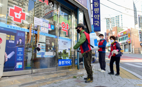 부산진구 한국자유총연맹당감4동분회(회장 최옥희)에서는 17일 코로나19 확산 방지를 위해 회원 10여 명이 참여한 가운데 주민 통행이 많은 거리와 버스정류장 등에 살균 소독액을 살포했다.