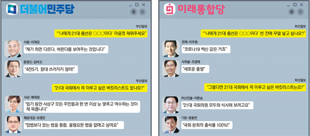 민주당 사하갑 최인호 의원은 싸우지 않는 정치를 하겠다고 했으며, 같은 당 남을 박재호 의원은 지역구인 남구 모든 주민에게 자신의 전화번호를 알려 지역주민과의 소통을 다짐하기도 했다. 민주당 수영 강윤경 후보는 패거리 정치를 종식시키겠다고 톡했고, 같은 당 북강서을 최지은 후보는 성과로 말하는 정치인이 되겠다는 소망을 적었다. 민주당 부산진을 류영진 후보도 ‘일하는 국회, 신뢰받는 국회’를 리스트에 올렸다. 40대 출마자인 통합당 북강서을 김원성 후보의 ‘헌혈을 100번 하겠다’는 소망도 실현이 기대되는 톡이었다.