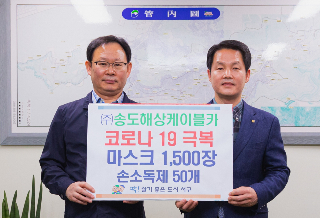 (주)송도해상케이블카(대표 최효섭)는 지난 18일 코로나19 예방을 위해 마스크 1500장과 손소독제 50개를 부산 서구(구청장 공한수)에 전달했다.