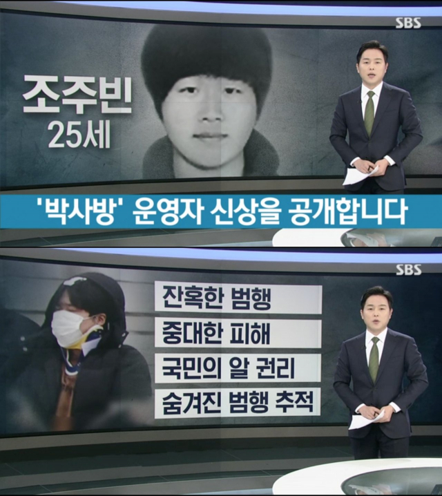 23일 방송된 'SBS 8 뉴스'에서 미성년자 등을 협박해 성 착취 영상을 불법 제작, 유포한 혐의를 받는 이른바 '박사방' 사건 피의자 조주빈의 신원을 확인해 공개했다.