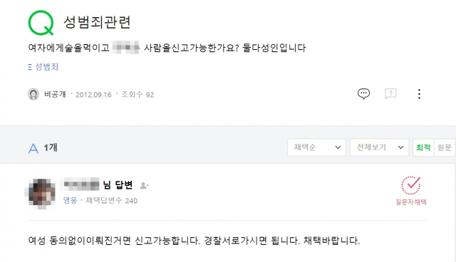 여성에게 술을 많이 마시게 한 뒤 성관계를 가진 사람을 신고할 수 있느냐는 질문에는 "여성 동의 없이 이뤄진 성관계라면 신고가 가능하다. 경찰서로 가면 된다"는 답변을 남겼다.