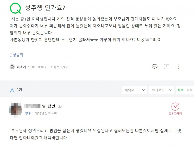 또 중학교 1학년 여학생이라고 밝힌 누리꾼이 "집에서 친척 동생들과 놀아주다 잠이 들었는데 깨어보니 알몸 상태였다. 어떻게 햐야하나"라고 묻자 "부모님께 상의드리고 범인을 잡는 게 좋겠다. 실제로 그랬다면 잡아내야 한다"고 답하기도 했다.