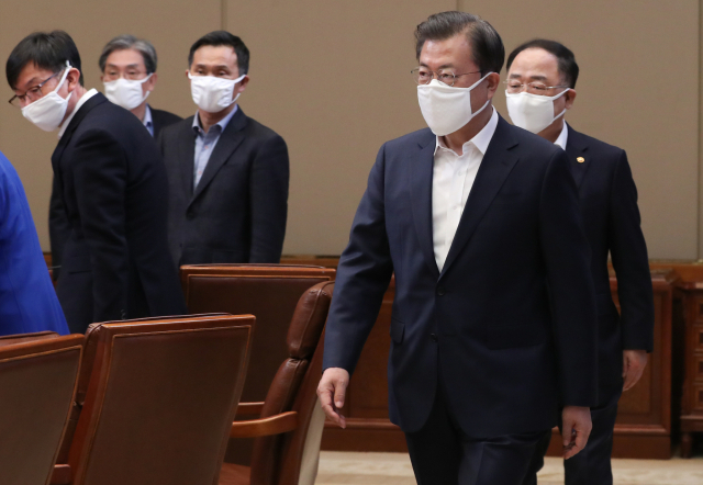 문재인 대통령이 30일 청와대에서 열린 코로나19 제3차 비상경제회의에 입장하고 있다. 연합뉴스