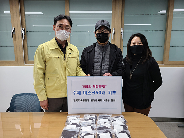 한국자유총연맹 금정구지회 서3동 분회(회장 이학봉)는 지난 27일 금정구(구청장 정미영) 서3동 행정복지센터에 코로나19 예방을 위한 수제 마스크 50매와 필터 50매를 기부했다. 이학봉 회장이 직접 본을 떠 박음질하고, 세탁·다림질·살균 등 마스크 한 장 한 장에 정성을 담았다.