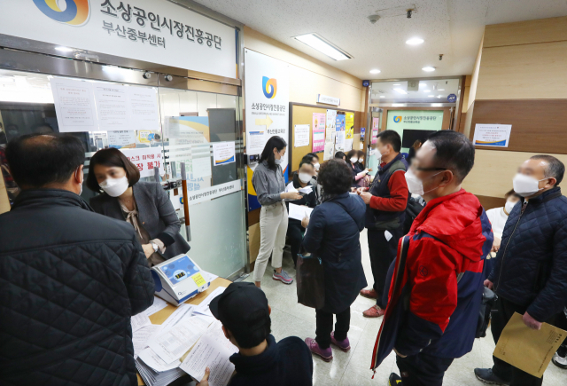 지난달 25일 소상공인시장진흥공단 부산중부센터에서 많은 소상공인이 코로나19 긴급 대출을 신청하기 위해 대기하고 있다. 부산일보DB