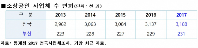 가장 최근 데이터인 '2017년 전국 사업체 조사' 자료에 따르면, 2017년 전국 소상공인 사업체는 318만 8000개에 달한다. 전년보다 5만 개가량 늘었으며, 매년 2만~10만 개 정도 증가하는 추세다. 같은 해 부산의 소상공인 사업체 수도 23만을 넘어설 정도로 소상공인이 지역 경제에서 큰 비중을 차지한다. 이들이 무너지면 지역경제가 초토화된다는 의미다.