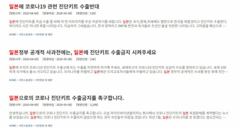 9일 청와대 국민청원 홈페이지에는 '일본으로의 코로나19 진단키트 수출금지를 촉구한다'는 제목이 국민청원이 게재됐다.