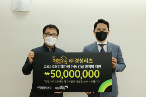 (주)경성리츠(대표이사 채창일·오른쪽)는 9일 코로나19 피해 저소득 가정 아동에게 긴급 생계비 지원을 위해 5000만 원을 초록우산 어린이재단(부산지역본부장 여승수)에 후원했다.