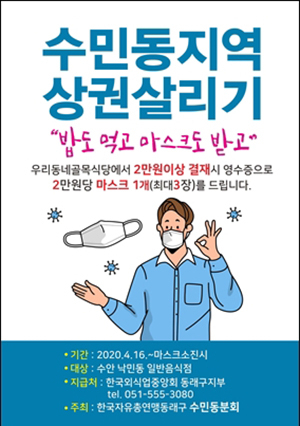 코로나-19 여파로 장기화됨에 따라 어려움을 겪는 동네 음식점을 지원하기 위해 회원들과 함께 고민하여 마련한 캠페인으로 한국자유총연맹 수민동분회는 수안·낙민동 소재 일반음식점에 홍보 포스터를 부착하고 KF94 마스크 1,000장을 한국외식업중앙회 동래구지부에 전달했으며, 영수증을 제시하는 손님들에게 배부할 예정이다.