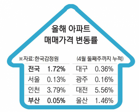 부산은 조정지역 해제 효과로 일부 집값이 ‘반짝 급등’하기도 했지만, 현재는 외지인 투기 수요가 빠진 데다 단기 급등에 따른 피로감으로 조정 국면에 접어든 상태다. 한국감정원의 주간 아파트 가격 동향에 따르면 4월 둘째 주 부산의 아파트값은 전 주보다 0.03% 떨어지며 6주째 하락세를 이어갔다. 부산은 올 들어 아파트값 누적 변동률이 0.05% 상승하는 데 그쳐 전국 평균(1.72%)에 못 미치는 것은 물론, 7대 특·광역시 중 최저 수준을 기록했다. 반면 서울의 고가 아파트 규제에 따른 ‘풍선효과’로 인천은 3.79%, 대전은 5.56%나 뛰었다. 이들 지역은 아직 비규제 지역으로 남아 있다.