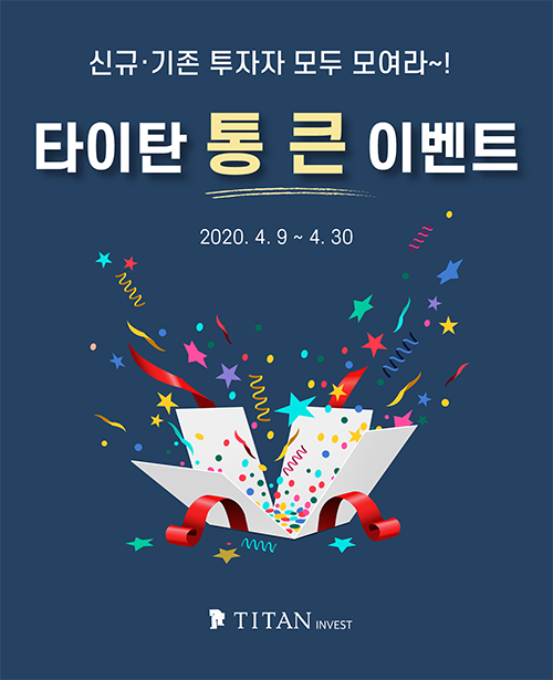 부산·울산·경남 지역을 대표하는 P2P금융사 ㈜타이탄인베스트(대표이사 채창호)는 오는 30일까지 신규·기존 고객을 대상으로 ‘통 큰 이벤트’를 진행한다고 밝혔다. 먼저 친구추천 이벤트‘니캉 내캉 더블로 가!’는 추천인으로부터 초대받은 친구가 회원가입 후 100만원 이상을 첫 투자하면 신규 고객과 추천인 모두에게 투자 금액의 1%를 신세계 모바일 상품권으로 지급한다.