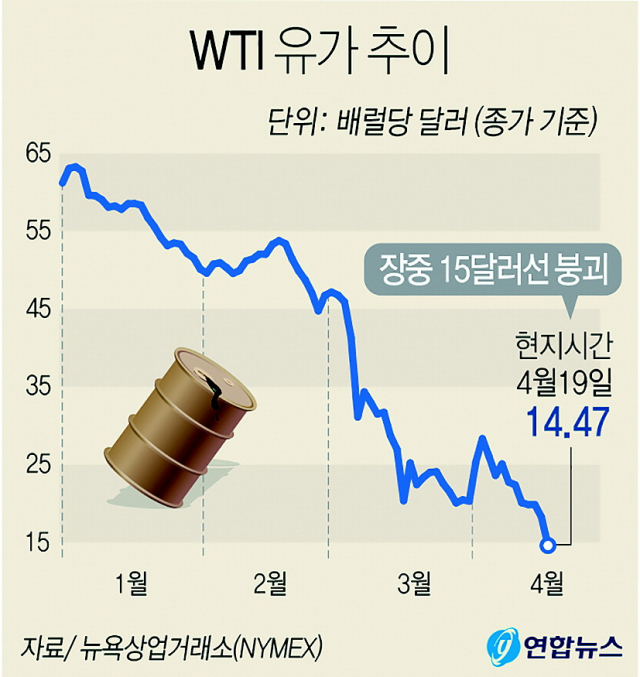 WTI 국제유가 배럴당 한때 14.47달러…21년 만에 최저치