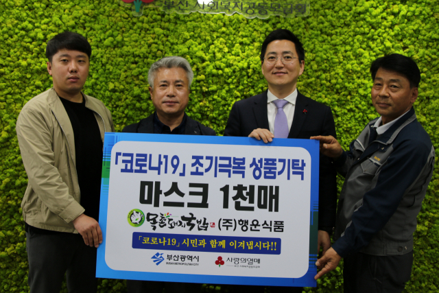 전판현(왼쪽 두 번째) (주)행운식품 대표가 지난 21일 부산사회복지공동모금회(회장 신정택)를 방문, ‘코로나19’ 극복을 위해 사용해달라며 마스크 1000장을 전달했다. 전 대표는 고액 기부자 모임인 부산 아너 소사이어티 회원으로 활동하고 있다.