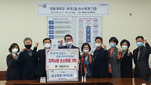 대동대학교(총장 배순철)는 지난 21일 지역사랑 실천과 코로나19 극복을 위해 교내 두피&모발연구소에서 개발한 손소독제 325개를 부산 금정구 부곡2동(동장 이춘화)에 전달했다.