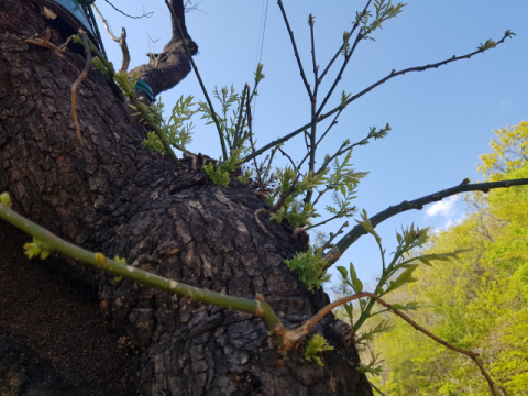 생육개선 사업은 지난달 17일부터 10일까지 실시하였고 공동충전, 인공수피 처리 등의 외과수술과 영양공급 및 뿌리발근제 처리 등 정성어린 돌봄을 통해 고목나무에서 기대하던 새순들이 나타났다.