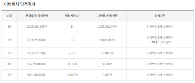 당첨번호 6개를 모두 맞힌 1등 당첨자는 11명으로 20억2106만원씩 받는다.