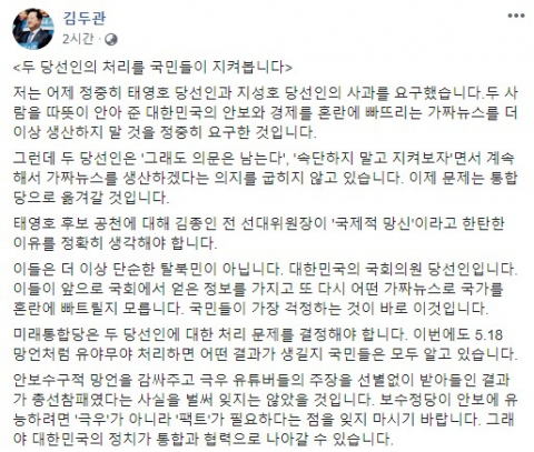 김 의원은 "두 당선인은 '그래도 의문은 남는다', '속단하지 말고 지켜보자'면서 계속해서 가짜뉴스를 생산하겠다는 의지를 굽히지 않고 있다"며 "이제 문제는 통합당으로 옮겨갈 것이다"라고 덧붙였다.