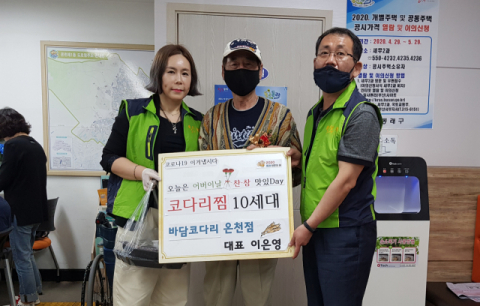 부산 동래구 온천1동(동장 서충훈)은 8일 어버이날을 맞이하여 지역 내 후원업소(바담코다리 온천점 대표 이은영)의 지원으로 무의탁 어르신 10세대에 ‘사랑의 도시락(코다리찜)과 카네이션’을 전달하였다.