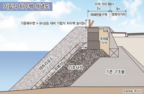 부산시 안에 따르면 기립식 차수벽은 현재 마린시티 영화의거리 호안 앞 7m가량의 해수면을 매립하고 최소 2m 높이로 세워진다. 기립식 차수벽은 평소에는 지면에 평행하게 눕혀 놨다가 재난 발생 직전 90도로 세워 파도가 넘어오는 것을 막는다. 시는 이르면 다음 달 중 검토회의 지적 사항을 보완해 기본설계안을 최종 확정지을 계획이다. 차수벽은 조수간만의 차를 막기 위해 마산만에 세워진 전례가 있지만 월파 방지 목적으로 국내에 세워지는 것은 이번이 처음이다.