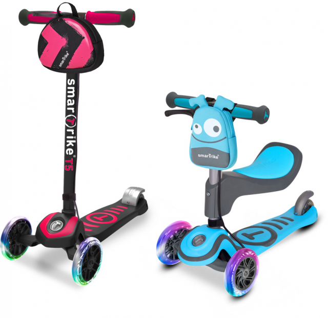 스마트라이크의 신제품 T스쿠터는 15개월부터 사용 가능한 T1(블루, 핑크) 2종과 5세부터 사용할 수 있는 T5(그린, 핑크) 2종으로 선보인다. 2020년형 T스쿠터 시리즈는 고정 벨크로를 이용해 스쿠터에 탈부착이 가능한 정품 캐릭터 백이 추가돼 소지품과 간식 등을 보관하기 편리하다.