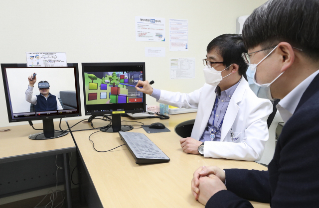 성상민 신경과 교수가 진료실에서 내원 환자에게 슈퍼 VR을 이용한 재활 훈련을 설명하고 있다. 부산대병원 제공