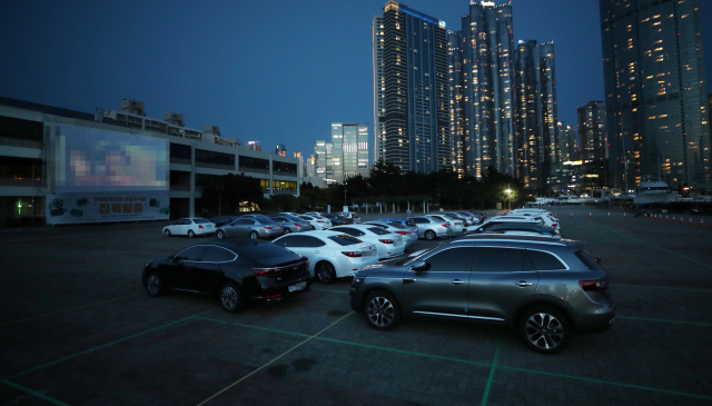 지난 23일 부산 해운대구 수영만요트경기장에서 아세안문화원 주최로 열린 자동차 극장 영화행사 ‘집콕탈출’에 참가한 시민들이 자동차를 타고 영화를 감상하고 있다. 이재찬 기자 chan@