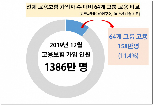 64개 그룹 직원 수는 158만 명으로 국내 전체 고용 인원 1386만 명(12월 고용보험 가입 기준)의 11% 수준이다.