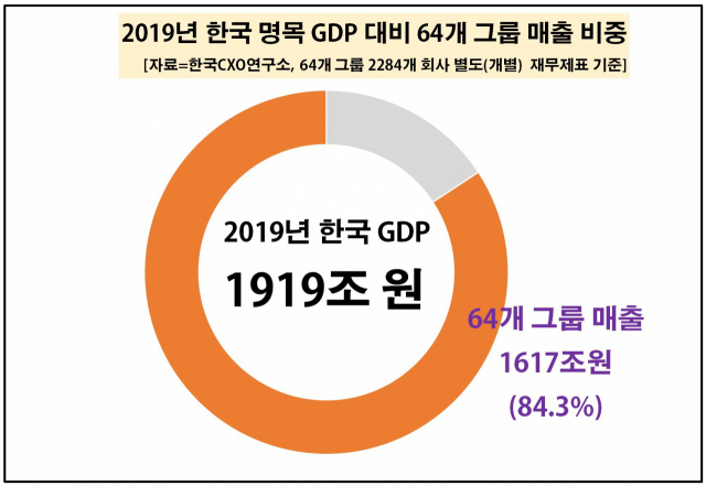 자산 5조 원 이상인 우리나라 64개 대기업 집단의 매출 규모가 우리나라 국내총생산(GDP)의 84% 수준에 달하지만 고용 비중은 11%에 그치고 있는 것으로 나타났다.