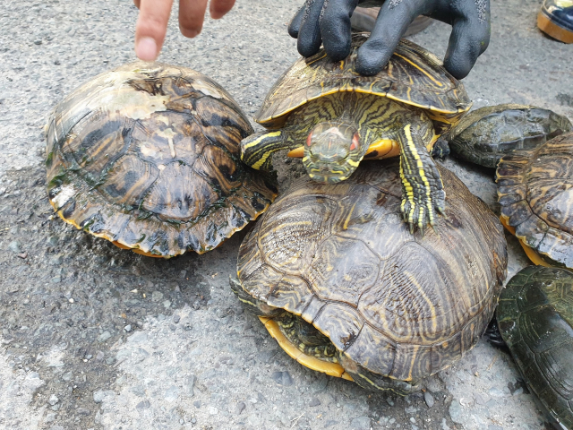 토종거북인 ‘남생이’ 보호를 위해 23일 진주 금산면 금호지에서 잡아낸 외래 생태교란종인 ‘붉은귀거북’. 진주시 제공