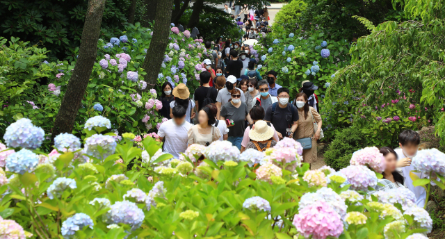 휴일인 28일 부산 영도구 태종대유원지 내 태종사를 찾은 관광객들이 활짝 핀 수국을 구경하고 있다. 태종사 일대에는 30여 종의 수국 5000여 그루가 군락을 이뤄 여름 명소가 되고 있다. 정종회 기자 jjh@