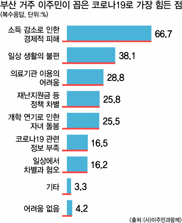 코로나19의 후폭풍은 이주민에게 더 가혹했다. 무급 휴직와 해고 등으로 일터에서 쫓겨나고 있다. 꼬박꼬박 세금도 내고 방역 수칙도 지켰지만 정부 지원 대상에는 배제돼 고난의 나날이 이어지고 있다. 30일 사단법인 ‘이주민과함께’는 올 5월 부산에 거주하는 이주민 333명을 대상으로 진행한 ‘코로나19로 인한 피해와 차별 경험’의 설문 결과를 공개했다. 이 조사에 따르면 부산 거주 이주민들은 코로나19 사태 이후 가장 힘든 점(복수응답)으로 ‘소득 감소로 인한 경제적 피해’(66.7%)를 꼽았다. 특히 응답자 중 상당수(29.1%)가 ‘월평균 100만 원 이상 소득이 감소했다’고 호소했다. 50만 원 이상 감소했다는 답도 절반(55.5%)이 넘었다.