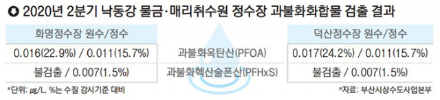 부산시상수도사업본부는 7일 2분기 먹는물 수질감시항목 검사 결과 낙동강 물금·매리취수원을 사용하는 화명정수장과 덕산정수장의 원수와 정수에서 감시기준에 미치지 못하는 과불화화합물이 검출됐다고 밝혔다.