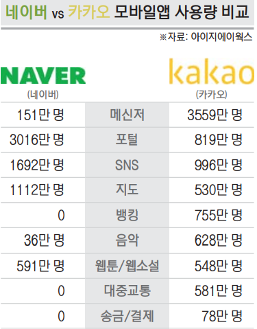 카카오는 네이버가 별도 앱을 운영하지 않고 있는 금융·결제·모빌리티 분야에서 카카오뱅크, 카카오페이, 카카오T 앱으로 점유율을 선점했다. 지난달 MAU는 카카오뱅크가 755만 명, 카카오페이가 78만 명, 카카오T가 581만 명이었다. 아이지에이웍스는 “하루 평균 사용자가 3500만 명에 이르는 안드로이드 기반 모바일 기기에서 생성되는 17억 건의 데이터를 인공지능 알고리즘으로 분석했다”고 설명했다.