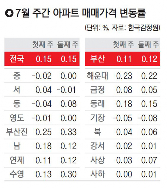 7·10 대책의 영향이 반영된 한국감정원의 ‘7월 둘째 주 주간 아파트 가격’에 따르면 부산은 이번에 0.12%가 올라 올 들어 가장 높은 상승률을 기록했다. 수영구와 해운대구가 각각 0.30%와 0.22% 올라 가격 상승을 주도했고, 범천동 철도차량정비단 이전 호재 등으로 부산진구(0.33%)도 많이 올랐다.