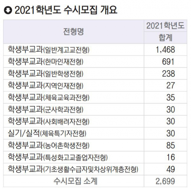 차문호 경남대 입학처장은 “2021학년도 수시모집에서 전체 모집인원 2907명 중 92.8%인 2699명을 선발하며, 작업치료학과와 기계공학부 스마트기계융합공학 전공 신설 등의 교육조직 개편으로 7학부(15전공) 44개 학과를 모집한다”고 밝혔다.