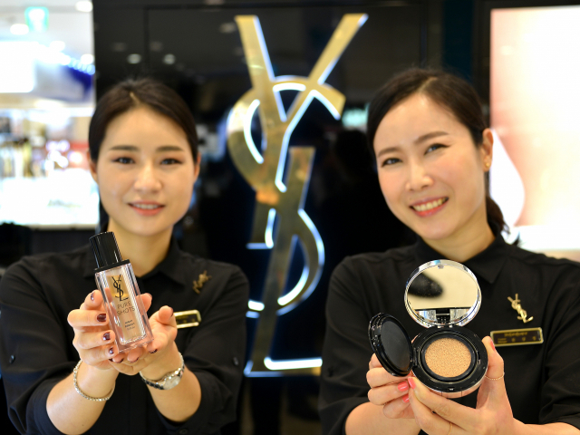 롯데백화점 부산본점 1층 입생로랑 매장에서는 매끈한 피부결을 만들고 안티에이징 효과가 있는 더블샷 세럼과 얇게 밀착되어 오래 지속되는 초밀착 파운데이션 제품을 판매하고 있다. 롯데쇼핑 제공