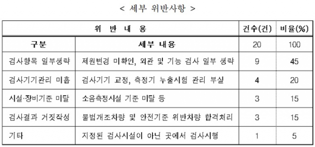 그 결과, 불법·부실검사가 의심되는 검사소 174곳 중에서 11.5%인 20곳이 적발됐다. 주요 위반사항은 제동력검사 생략 등 검사항목의 일부 생략이 9건(45%)으로 가장 많고 검사기기관리 미흡 4건(20%), 시설·장비기준 미달 및 검사결과 거짓작성 각각 3건(15%), 지정된 검사시설이 아닌 곳에서 검사시행 1건(5%) 등이다.