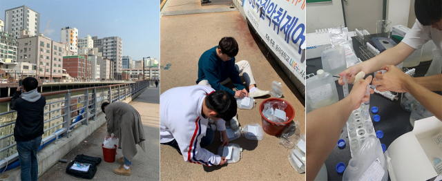 동아대 토목공학과 상하수도시스템 연구실 팀원들의 부산 사하구 괴정천 연구조사 활동 모습. 동아대학교 제공.